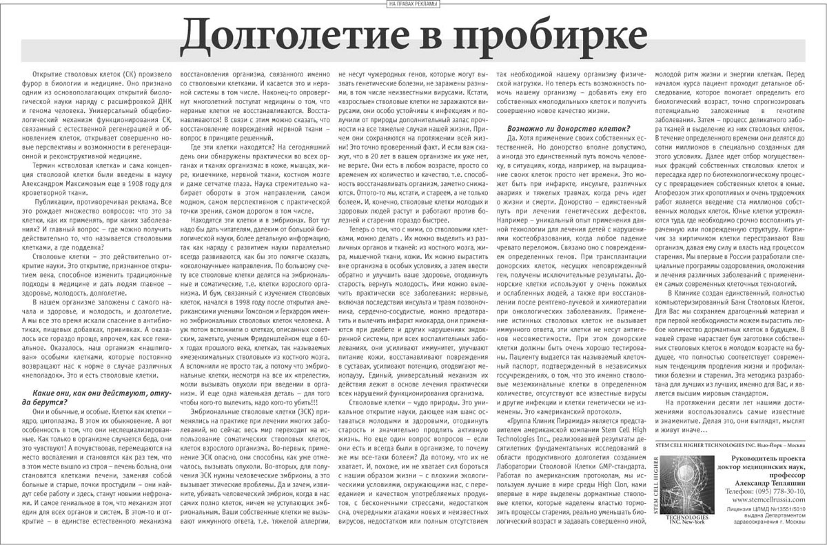 Пресса о Центре клеточных технологий молодости