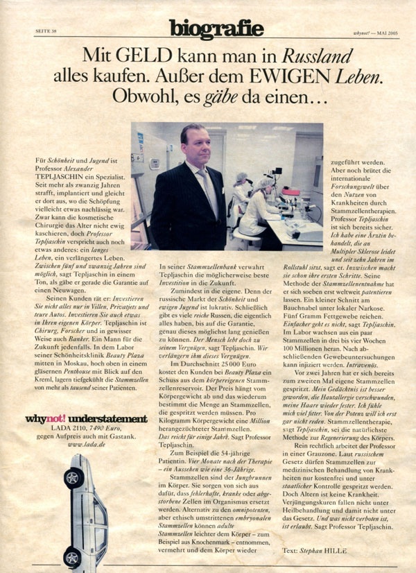 «Russians ignore risks, seek stem-cell therapy», Seattle times, март 2005