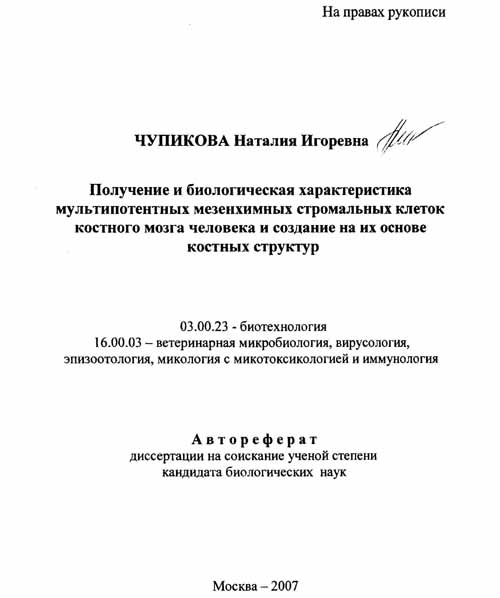 Данная диссертация посвящена теме разработки эффективного способа выделения ММСК из костного мозга человека и полной характеристике выделенных клеток. Кроме того, был разработан метод получения in vitro костных структур, способствующих заживлению дефектов костной ткани.