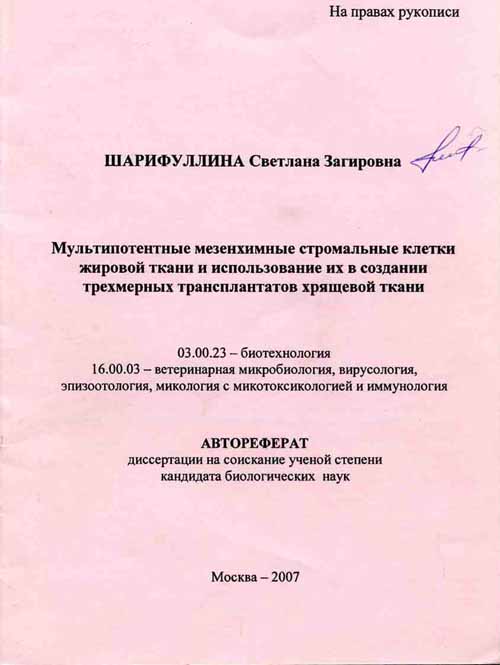 В данной диссертации рассмотрен вопрос выделения и характеристики ММСК из подкожно-жировой клетчатки человека. На основе данного клеточного материала был разработан метод создания in vitro трехмерных трансплантатов хрящевой ткани.