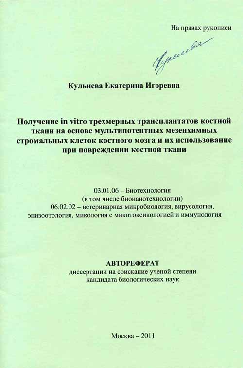 > Кульнева Е.И., Коржикова С.В., Тепляшин А.С. Создание трансплантатов костной ткани in vitro, на основе синтетического матрикса и клеточного материала / Всероссийская научная школа – конференция: Стволовые клетки и регенеративная медицина: сб. науч.тр. – М.: МАКС Пресс. – 2010. - С.44.